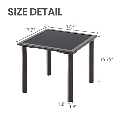 Tempered Glass: This patio end table with 0.2 inches(5mm) thick transparent tempered glass and lets you place drinks, meals, or decorative items on most sensible.The highest is easily wiped clean up with damp cloth and water