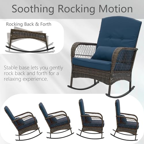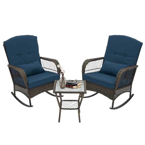 • Outdoor Wicker Rocking Chairs 3 Pieces Patio Furniture Rattan Rocker Chairs Wicker Rocking Set with Cushions and Side Table for Garden Patio Yard Porch Lawn Balcony Blue