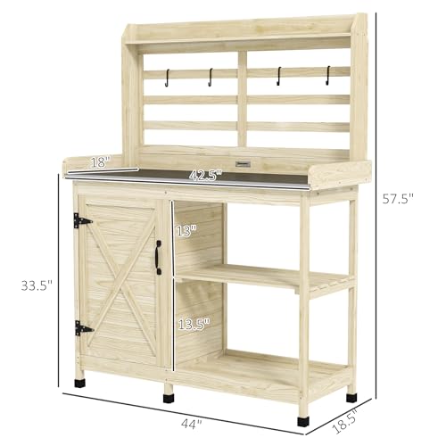 Potting Bench with Storage Info: Dimensions: 44.1″ L x 18.5″ W x 57.5″ H. Maximum Load: 165 lbs (tabletop), 11 lbs (top shelf), 22 lbs (other shelves). Easy assembly required.