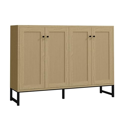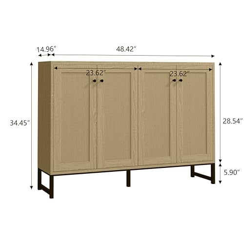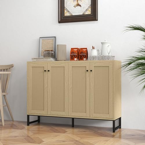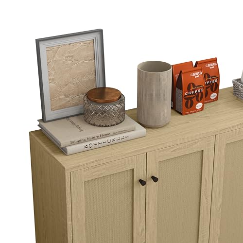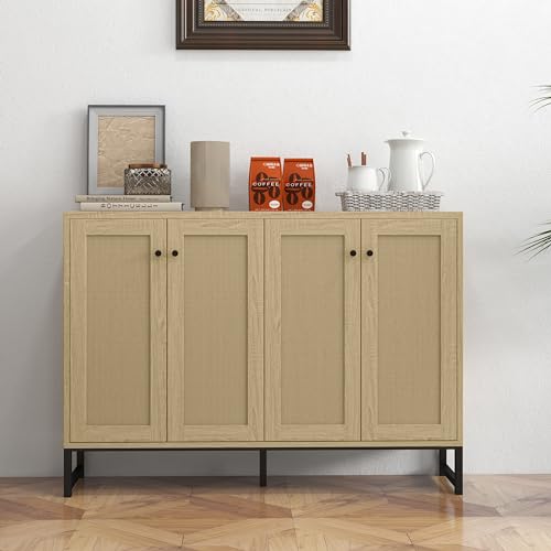 Panana Sideboard Accent Storage Cabinet with Rattan Decorated 4 Doors Dining Room Freestanding Kitchen Buffet Table Cupboard (Natural)