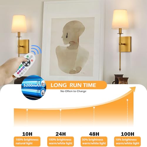 Rechargeable Bulbs with Extended Runtime: Each and every sconce features a rechargeable LED bulb with a robust 5200mAh capacity. Experience up to 24 hours of continuous lighting on the brightest setting or an impressive 100 hours on the dimmest. With 10 adjustable brightness levels (10%-100%), you’ll be able to easily create the easiest ambiance for reading, entertaining, or unwinding.