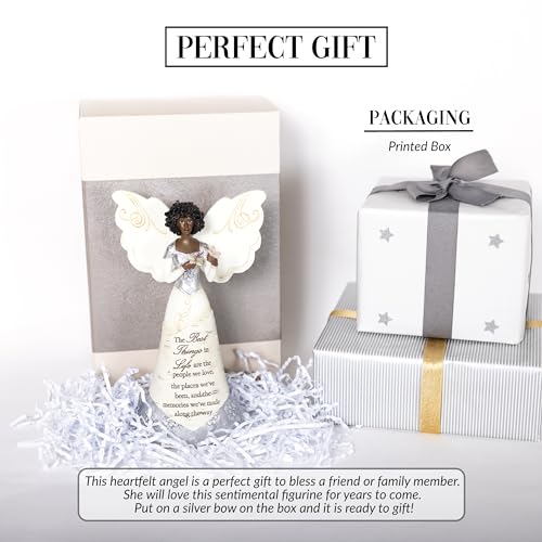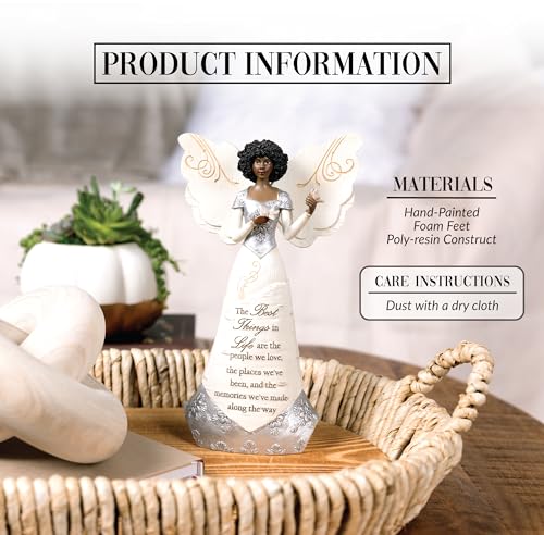 This 8″ tall x 5″ long x 2″ wide angel figurine is a beautifully crafted piece made from resin with foam feet and intricate hand-painted details, featuring handcrafted birchwood styling with embossed and debossed elements. The angel’s wings display graceful swirled patterns, and its neutral silver and cream weathered finish complements both rustic and modern decor styles. Foam feet on the bottom give protection to surfaces from scratches. Carved with the sentiment, “The Best Things In Life Are The People We Love, The Places We’ve Been, And The Memories We’ve Made Along The Way,” on the bottom half of her dress, this angel holds butterflies in each and every hand and features lovely short hair framing her face. Detailed silver floral and damask-style accents add to her charm. This angel figurine serves as a cute religious house decor piece, perfect for friends who embrace their faith and love to celebrate Christ in their homes. Maintenance is simple, just dust with a dry cloth, and it comes securely packaged in a gift box for simple wrapping. Explore our range of religious angel figurines and circle of relatives and mom gifts in our storefront to fulfill your gifting needs for more than a few occasions.