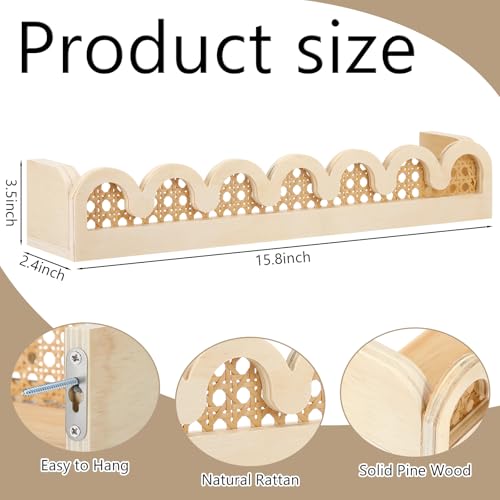 The shelf measures about 15.8 x 3.5 x 2.4 inches, crafted from robust wooden material, with its 7mm thickness, adorned with rattan, offering both strong and durable properties, wood finish and rattan wall decor brings a warm design to boho nursery decor addition