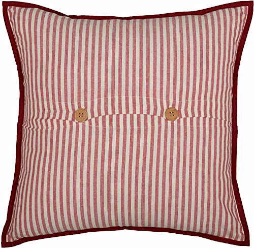 100% Textured, cotton, substantial weight but soft feel, in a warm creamy colored fabric. Red stenciling and red piping along outer edge finishes the pillow with simple red and white ticking on the reverse.