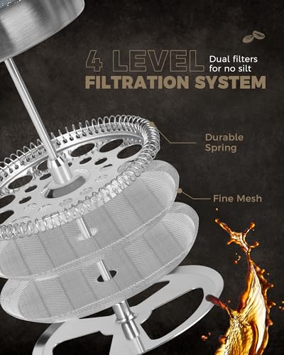 LOOKING FOR COFFEE PRESS FOR MATCHING UP YOUR KITCHEN? We, the POLIVIAR french press coffee maker will be your smart choice. Even as the coffee pot is made from food grade stainless steel with stylish long-lasting coating, It is easily to match up your kitchenwares and your kitchen’s theme. Also, the ergonomic deal with with real wood will maximize the implausible time of grounds you loved.