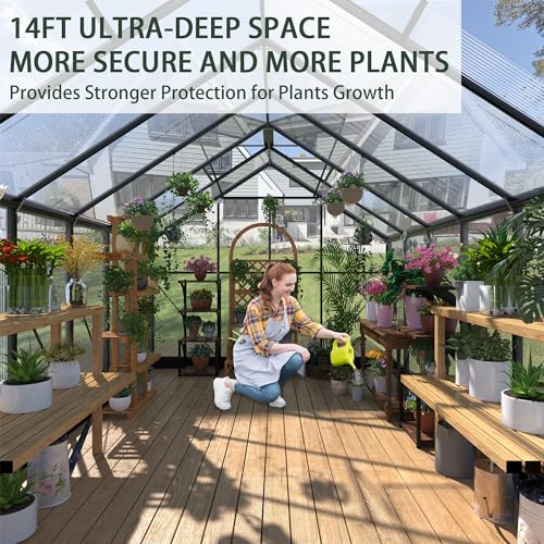 HUMIDITY CONTROL BY YOURSELF: Our greenhouse has a four-level adjustable roof vent that lets you let in fresh air whilst simply managing excess moisture. Fine-tune the angle and bring plants into balance with their growing space.It can also provide an optimal growing environment for your plants. The 8×14 FT greenhouse has a spacious space that can fit enough plants and gardening gear; after assembly, you’ll immediately enjoy the excitement of growing plants.