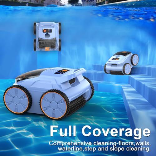Works on More than one Pool Types & Sizes: Compatible with both above-ground and most inground pool types, this robot pool vacuum can efficiently clean pools of varying shapes and sizes. Whether you have a small above-ground pool or a large inground pool, it offers excellent cleaning performance. Its flexible design allows it to deal with irregular surfaces and deep slopes. It can clean a 500 sq. ft. pool up to four times on a single charge, making it versatile and effective for different pool sizes