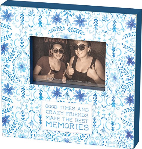 A watercolor art-inspired, blue and white wood box sign frame lending a “Excellent Times And Crazy Pals Make The Perfect Reminiscences” sentiment with floral print designs. Simple to hold or can free-stand on my own; can display a 6″ x 4″ photo. Complements neatly with coordinating design items.