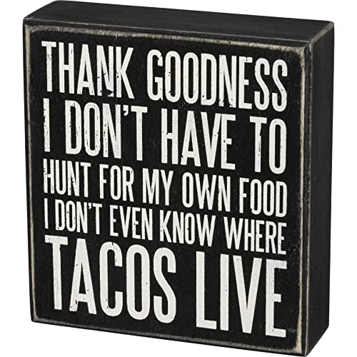 A classic black and white box sign that includes “Thank Goodness I Do not Have To Hunt For My Own Food I Do not Even Know Where Tacos Reside” sentiment. Simple to hold or can free-stand on my own.