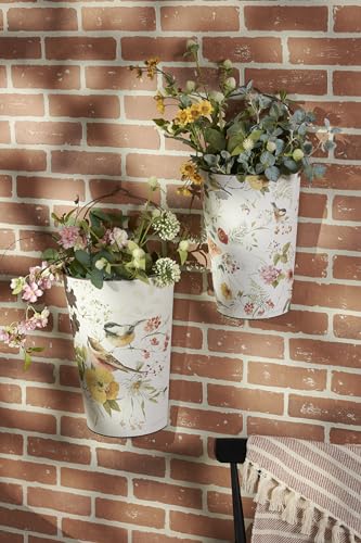 A set of metal wall buckets displaying comforting scenes of chickadees and spring flowers. Designs are replicated from original art hand painted in a delicate watercolor style. Set includes two buckets in different sizes that nest inside every other for convenient storage. Our Chickadees wall bucket set includes a flat back and metal take care of with a small groove on the top for simple hanging. Buckets too can free-stand on a flat surface. Greenery pictured not included. A charming home accent best possible for seasonal displays.