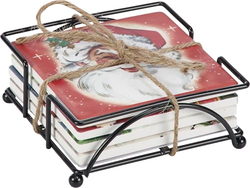 A coordinating set of 4 stoneware coasters with cork bases from our Christmas Collection displaying vintage jolly Santa designs on Every. Our Santa Claus coaster set features a wire holder to store coasters and springs packaged with jute rope tied around set. A a laugh and useful seasonal home accent easiest for any room.