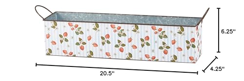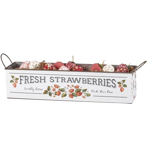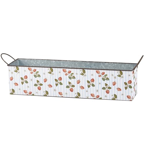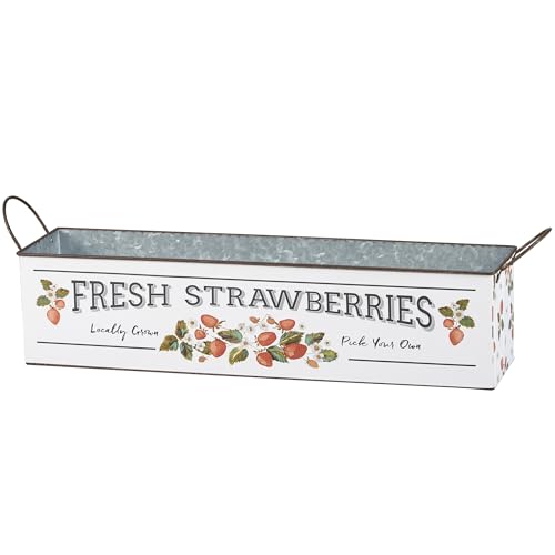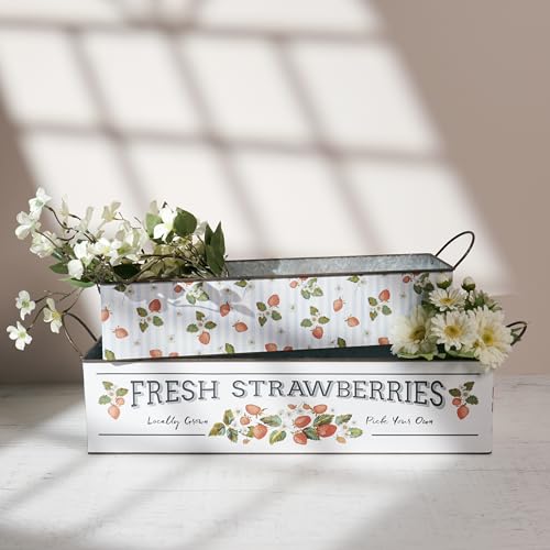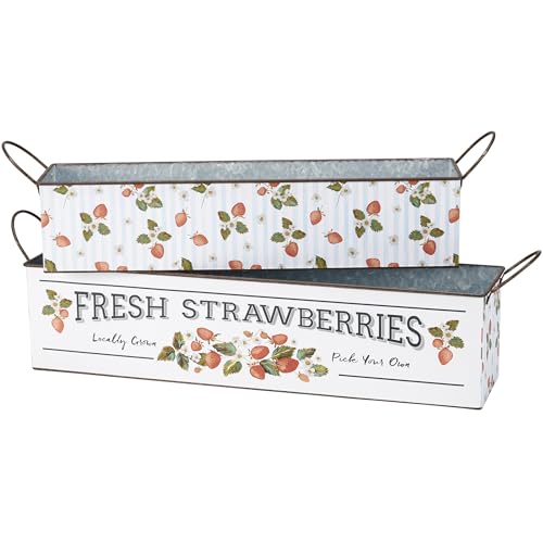 A galvanized metal bin set from our Garden Collection including two different sized rectangular bins with metal handles at the sides that may nest within Every other for simple storage. Every bin displays strawberry themed designs replicated from original art hand painted in a unique watercolor style. Larger bin displays a “Fresh Strawberries – In the community Grown Pick Your Own” sentiment with wild strawberry designs. Smaller bin displays a wrap-around design of strawberries and flowers on a complementing stripe pattern. Our Fresh Strawberries bin set is for decorative use only and isn’t food protected. Greenery and accessories pictured not included. A rustic on a regular basis home accent with numerous display options.
