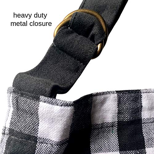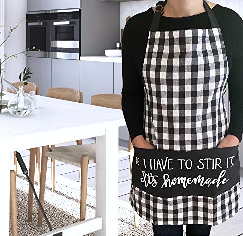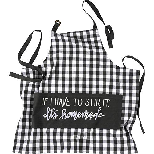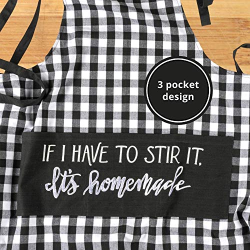 A black and white checkered apron that includes a middle pocket with hand lettered “If I Have To Stir It, It is Selfmade” sentiment. Options polyester and cotton subject matter and adjustable straps. Gadget-washer-friendly.