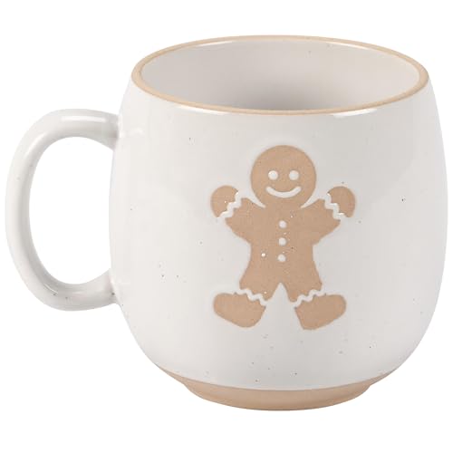 A stoneware 18.5 ozmug from our Christmas Collection displaying a cream colour with debossed gingerbread man in brown colour at the outdoor and bare ceramic detail at the base and rim. Our Gingerbread Man mug is conveniently microwave, dishwasher, and food secure for simple use. A a laugh gingerbread-themed gift best for seasonal drinkware.