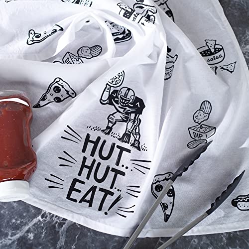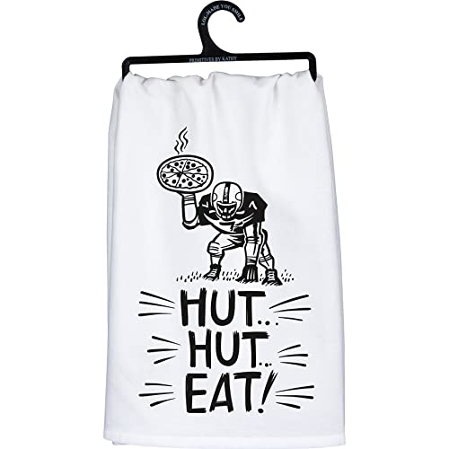 A black and white cotton kitchen towel exhibiting a amusing hand illustrated design of a soccer participant holding a pizza and all-over designs of birthday party food with humorous “Hut… Hut… Eat!” sentiment. Our Hut Hut Eat kitchen towel is machine-cleanable for handy cleaning.