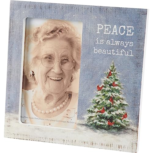 A wooden photo frame displaying a snowy scene of a tree with cardinals at the branches and “Peace Is All the time Beautiful” sentiment. Design is replicated from original artwork painted onto burlap canvas, giving the art a unique depth and texture. Sides and back feature coordinating white color. Frame fits a 3 inch x 5 inch photo and can easily be replaced by way of clips on back. Our Peace Is All the time Beautiful plaque frame is easy to display the use of metal easel on back to free-stand. An exquisite option for displaying favorite memories as seasonal home décor.