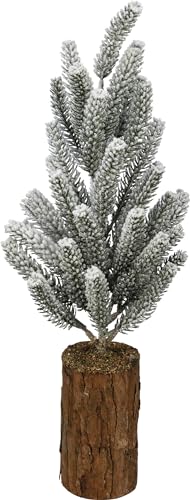 DECORATIVE TREE: Festive winter evergreen tree that includes a tall log base