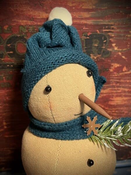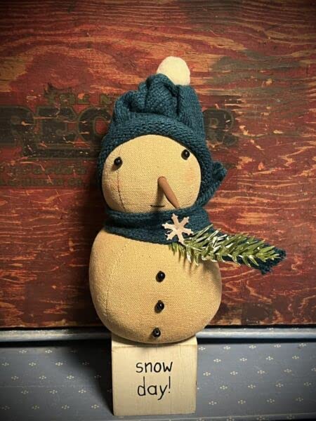 Grubby Primitive Rustic Christmas Sweet SNOW DAY Rag Doll Snowman on Block 7″ – By Hasulo