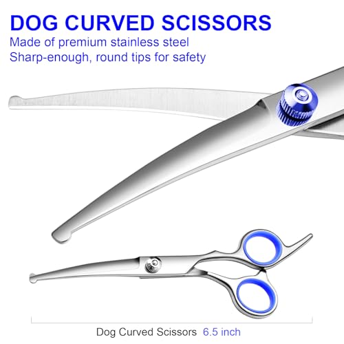 Practical dog scissors kit: Dog grooming scissors kit includes 6.5-inch thinning shears, 6.5-inch curved scissors, grooming comb, cleaning cloth, and black case. So it can trim any a part of your pet such as body, face, nose, ear, tail, paw and so forth