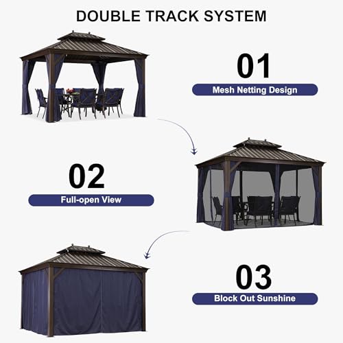 Comes with UPGRADED yarn-dyed polyester curtains, color fastness as much as 2 years. The gazebo has two rails to adjusted the state of the netting and curtains as desired.