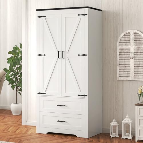 【Turn into Your Home with Rustic Charm】Featuring 2 classic barn doors, a white finish, and black metal accents, our pantry cabinet seamlessly blends brand new rustic aesthetics with vintage farmhouse charm.