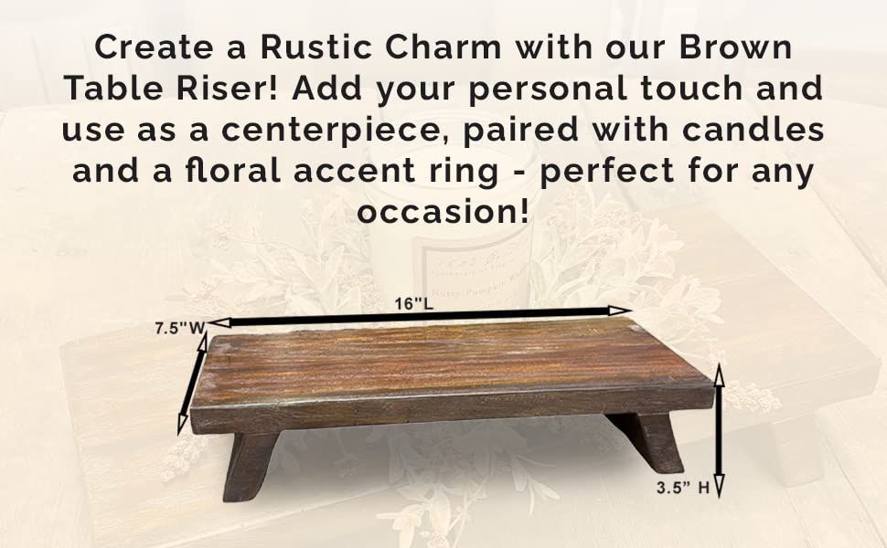 ELEVATE YOUR HOME Your home is a refuge. A gathering place for friends and family. An inspiring space to chill out, unwind, and be yourself, surrounded by all the beautiful things you’ve collected over the years. Your home is also a reflection of how you love to live, so when you choose home decor, you opt for exceeding quality, style, and uniqueness. With more and more flimsy particle-board items being mass-produced nowadays, it’s rare to find house decor that checks all the boxes. Get ready to raise the bar on farmhouse decor. This wooden table riser is an exceptional, handmade piece you’ll’t find just anywhere. Handmade with unparalleled craftsmanship, this one-of-a-kind pedestal stand features a rustic look with varying, naturally-occurring grains and knots. Its only flaw is that it looks good all over the place! Place this decorative tray on your kitchen table or counter, dining table, at your front entrance, or use it to display a framed photo or elevate your laptop. Handsome, Charming & The Real Deal 3.5” H, 7.5” W, 16” L . Solid sturdy construction Uniquely distressed design Handcrafted from robust Mindi hardwood Hand-painted–Choose between Rustic Black or Brown We take pride in our work, and your satisfaction is important to us. If you’re not thrilled with your new wooden table riser for any reason, please let us know!