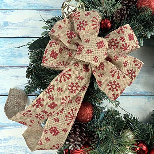 Ribbon for Gift Wrapping – Rustic Burlap Christmas Bow emblazoned with Red Snowflakes for Festive Christmas Decoration – 10 inches wide and 18 inches long from top of the bow to the bottom of the tails