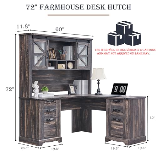 Gorgeous & Grandeur Farmhouse L-Shaped Desk with Hutch: The classic double pedestal design gives this home office desk a heavy-duty and grandiose look while a fluent linear border on drawer faces, and hand-rubbed burnished hardware, provide sophisticated architectural detailing. Also, warm antique finishes are wonderfully easy on the eyes and it has natural variations in color, and texture, giving every piece a unique look, and adding a touch of a homey and rustic farmhouse aesthetic.