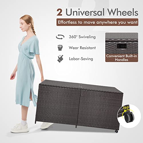• RELAX4LIFE 175 Gallon Storage Deck Box Outside Wicker Storage Container with Zippered Liner 2 Universal Wheels Gas Strut Patio Rattan Storage Bin for Backyard Front Porch Outdoor Box Brown