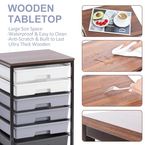 WOODEN TABLETOP & THICK DRAWERS & METAL FRAME: Storage drawer cart with wooden tabletable top lets you put plants,paper cutting printer, printer and other decorations.Drawers are made of thick and durable plastic material.Holds 33 pounds on tits op plate and 11 pounds per drawer.The utility cart with drawer boasts a sturdy and durable powder-coated steel frame with water and rust resistance ensures a sturdy construction and built to last.