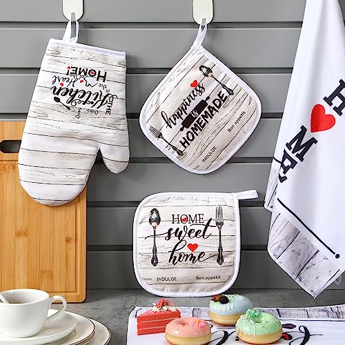 Farmhouse Design: the dish towels, kitchen mitts and pot holders are designed with wood plank patterns, and there are letters of [Happiness is Homemade], [Family], [Home], full of rustic farmhouse sense, which well blend with more than a few kitchen decorations