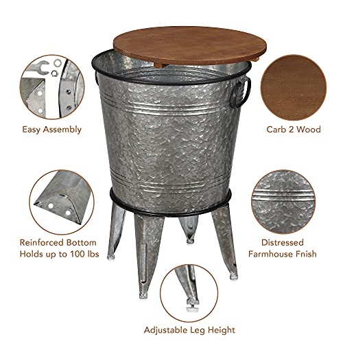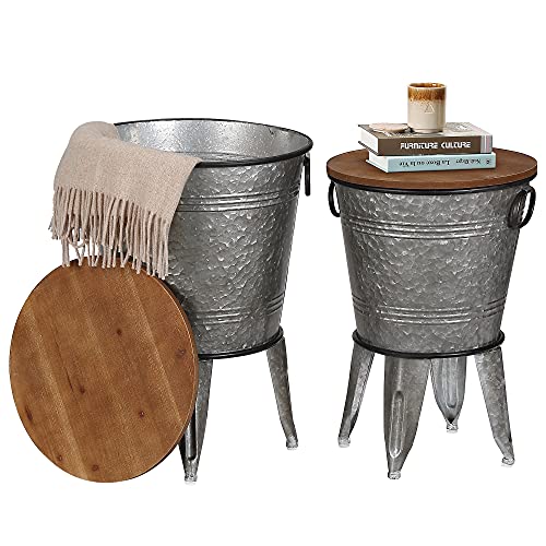 Rustee Rustic Storage Farmhouse Accent Side Table,Antique Galvanized Metal End Coffee Cocktail Table Box Bin with Round Wooden Lid Set of 2 (Galvanized),HC2009WT,One size