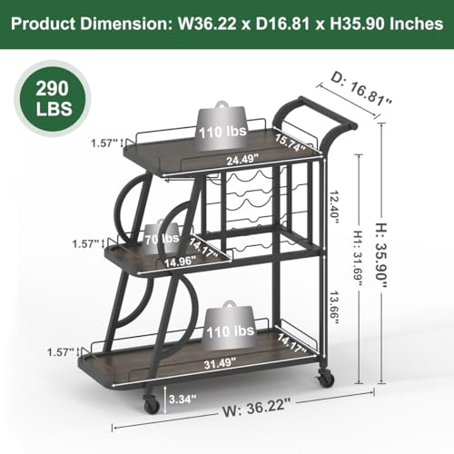 【Sturdy Material and Large Capacity】The overall dimensions are D16.81 x W36.22 x H35.9 inches (with maintain) . Crafted from high-quality MDF board and heavy-duty metal frame, this rolling bar cart for home, featuring a beautiful rustic wood grain, can beef up up to 290 lbs, ensuring durability for years of use.