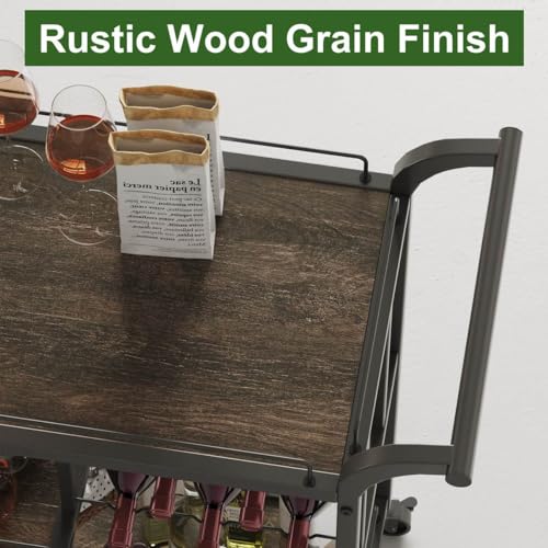 Rustic Bar Cart for The Home, Home Bar Serving Cart, Metal Wood Liquor Cart with Wheels, 3 Tier Rolling Drink Cart with Wine Rack and Glass Holder, Mobile Beverage Cart (Walnut Brown)