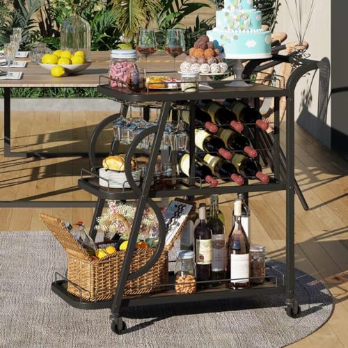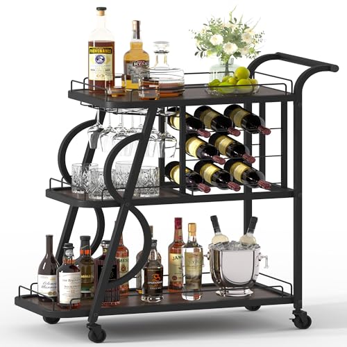 【Versatile Bar Cart】Elevate your entertaining experience with this multifunctional home bar serving cart. Boasting three tiered shelves of varying sizes, a stemware rack capable of accommodating up to 9 glasses, and a wine rack that holds 8 bottles, this bar cart with wheels combines both aesthetic appeal and practical functionality. Perfect for placement in dining room, kitchen, living room, or outdoor spaces when hosting BBQs or parties.
