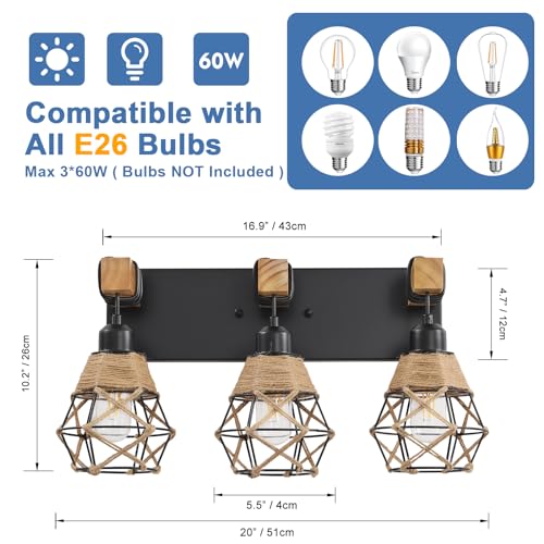 Rustic Style Wood Bathroom Wall Sconce,3 Light Bathroom Vanity Light Fixtures, with Boho Wicker Twine Lampshade,Suitable for Bedroom, Hallway, and Living Room,Rattan Black Farmhouse Wall Sconce