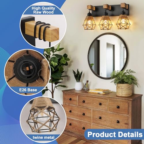 • Rustic style wood bathroom wall sconce3 light bathroom vanity light fixtures with boho wicker twine lampshadesuitable for bedroom hallway and living roomrattan black farmhouse wall sconce  urban country home decor
