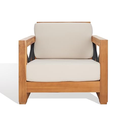 Roomy chair is crafted from sturdy teak Wood and includes plush cream colored cushions for optimum comfort