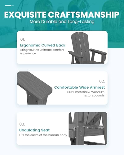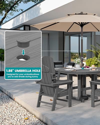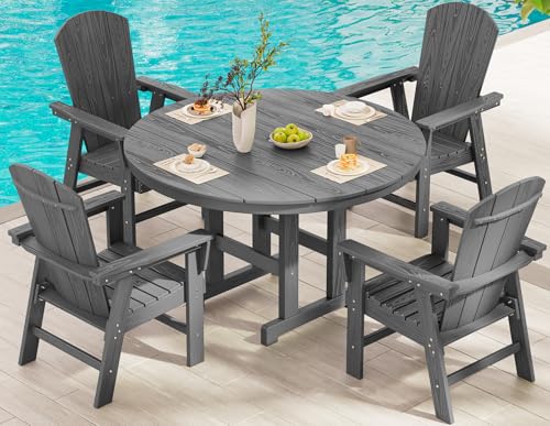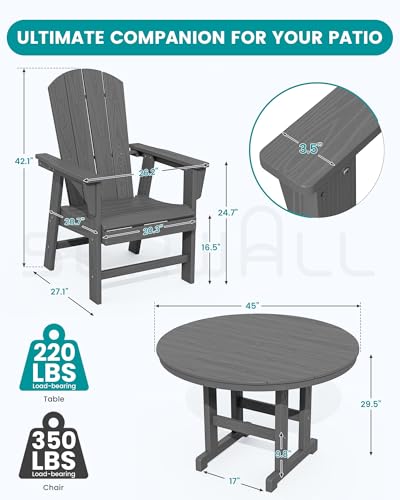 Generous Space and Comfort: The set features a spacious 45-inch round dining table with a sturdy aluminum-reinforced base, offering ample room for meals or gatherings. Complementing it are four ergonomic Adirondack chairs with curved backrests, providing exceptional comfort and give a boost to for up to 350 pounds.