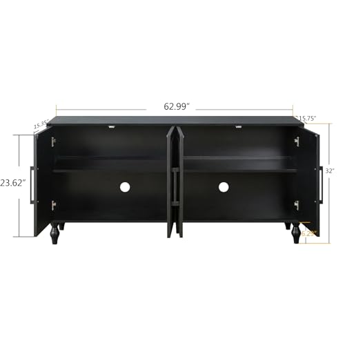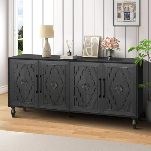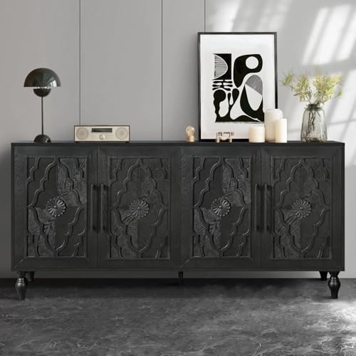 Elegant Sideboard: With antique black finish, Roman column style cabinet legs, and the doors designed with delicate carved flowers and slim metal handles, this buffet cabinet perfectly combines vintage element with up to date aesthetics. Dimensions: 63″ (L) x 15.75″ (W) x 32″ (H).