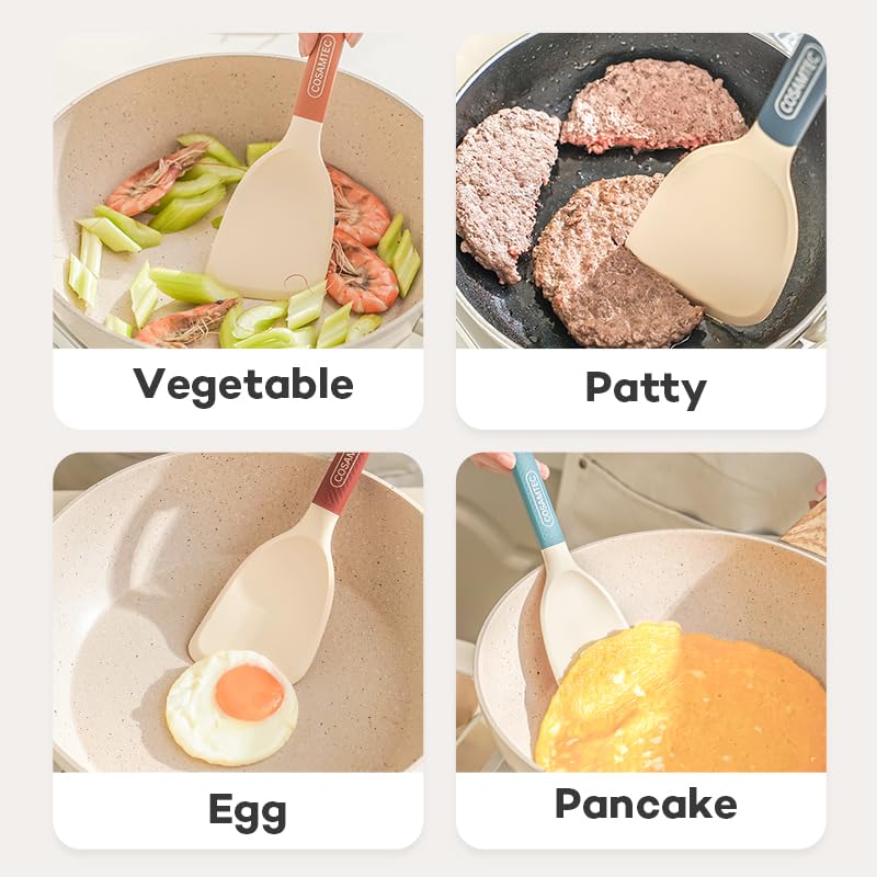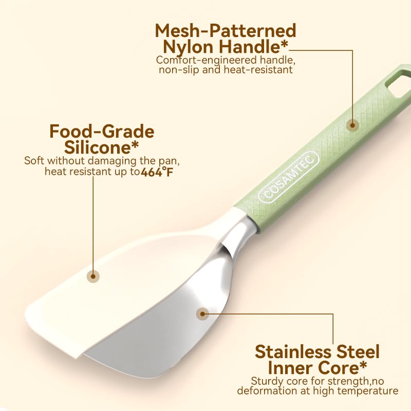 【Heat-Secure Slicone Outer Layer】The silicone outer layer is bonded to a chrome steel inner core and protects your pan surfaces from scratches. Additionally, They’re heat resistant up to 464°F(240°C), making it Secure to use for cooking tasks such as flipping pancakes without fear of melting or warping.
