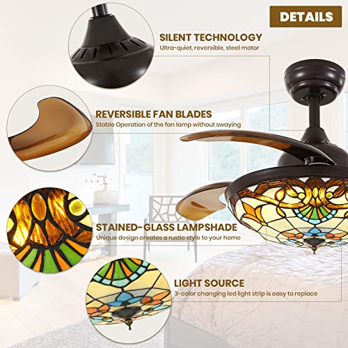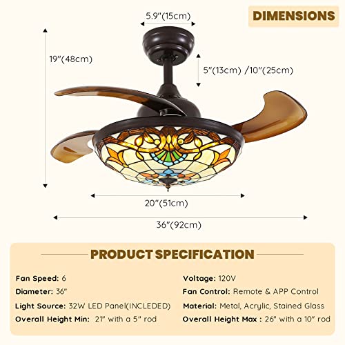 APP CONTROL & 3 LIGHT COLORS: Classical retractable ceiling fan with lights has individual fan/light can also be controlled by both remote keep an eye on and APP. Tiffany retractable ceiling fan can create a cozy atmosphere, cool white(6000K) for work/study, natural white(4500K) for circle of relatives life and warm white(3000K)for rest. Stained fandelier is equipped pure copper motor, which is silent and stable power output, brings you a suitable living or sleeping environment.