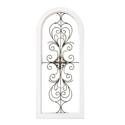 [FARMHOUSE WOOD AND METAL WALL DECOR] The wrought iron design is framed in wood, giving this rustic wall art a victorian country farmhouse look. The combination of white distressed wood and wrought iron gives this wall feature a vintage appeal.