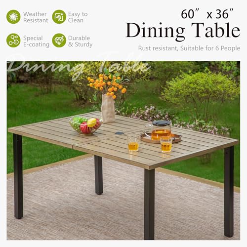 Spacious Metal Dining Table: 60″ x 36″ table with wood-like tabletop provides ample space for food and drink. Straight legs are beautiful and provides quite a few room to push chairs in easily. 1.6″ – 2″ adjustable umbrella hole