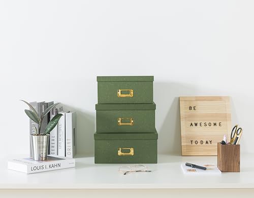 • Soul Lane Green Kraft Paper Boxes for Storage Set of 3 Square Stacking Boxes with Lids and Gold Label Holders Decorative Photo Storage Nesting Cardboard Set for Decor and Organizing