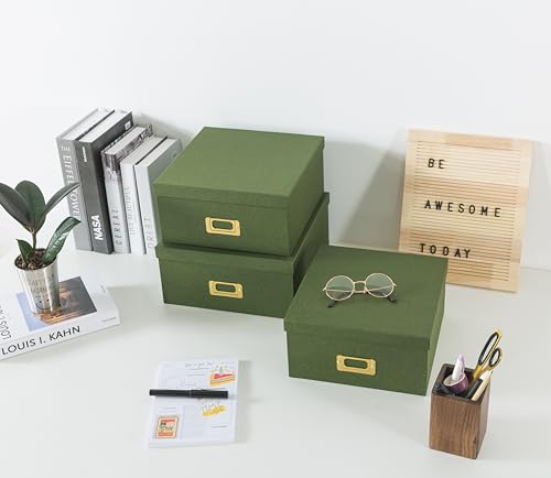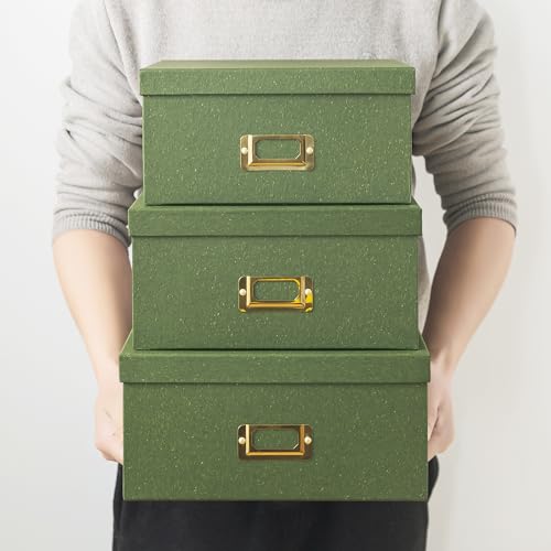 DURABLE BY DESIGN: Constructed with premium paperboard and finished with a kraft paper, these green boxes aren’t only solid and resilient but are also designed to endure through years of use. Whether stacked together or used individually, these boxes will maintain their form and function. The set comprises three sizes: Small – 10.0 x 10.0 x 4.9 inches, Medium – 10.6 x 10.6 x 5.1 inches, and Large – 11.2 x 11.2 x 5.3 inches, ensuring you have the right size for every need.