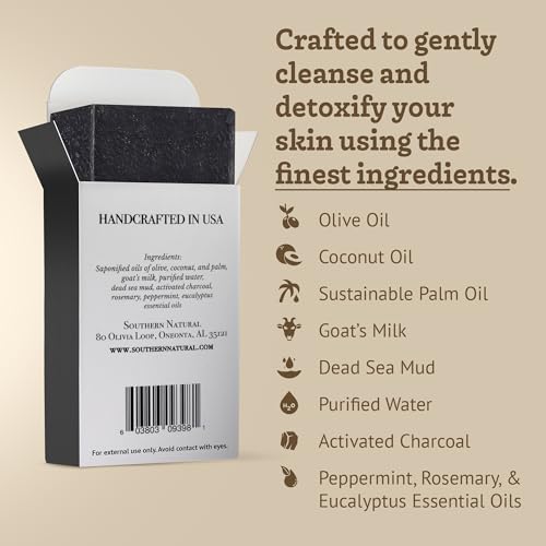 • Southern Natural Activated Charcoal Soap Bar 3 Pack Face and Body Soap For Sensitive Skin With Dead Sea Mud Goat Milk Peppermint Essential Oil