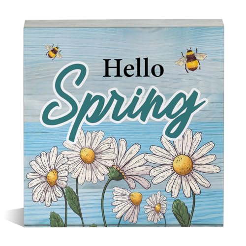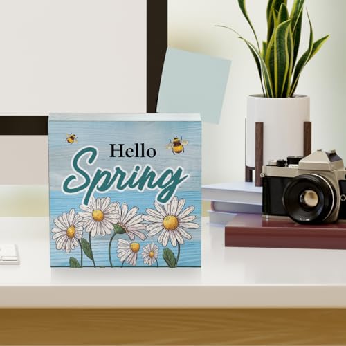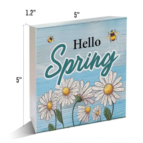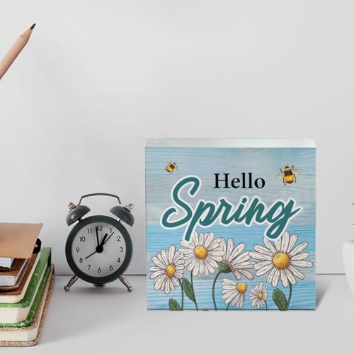• Spring Wooden Sign Hello Spring Wood Block Sign Rustic Daisies Spring Decorative Desk Sign Home Shelf Tabletop Decor 5 X 5 Inches