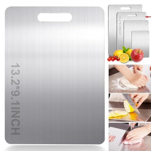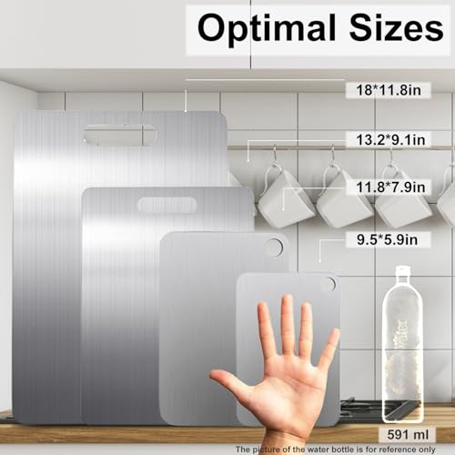 [Convenient and efficient]: steel chopping boards for kitchen have a porous surface. There’s no want to worry that the kitchen cutting board will leave residue and have an effect on your health. It only must be rinsed with water to clean.