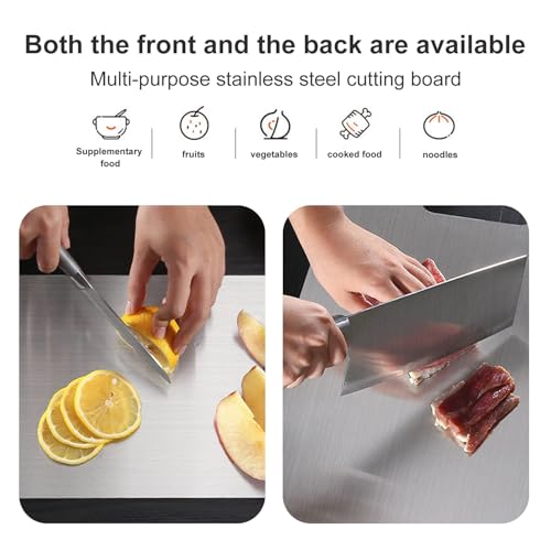 [Extensive use]: Stainless steel cutting boards can be utilized on both sides, and different foods may also be cut one after the other to avoid cross-use. Whether you roll pie and dough, knead bread, process vegetables, make sandwiches, or fruits, vegetables, bread, and so forth., our cutting board can easily bear a wide variety of cooking tasks.
